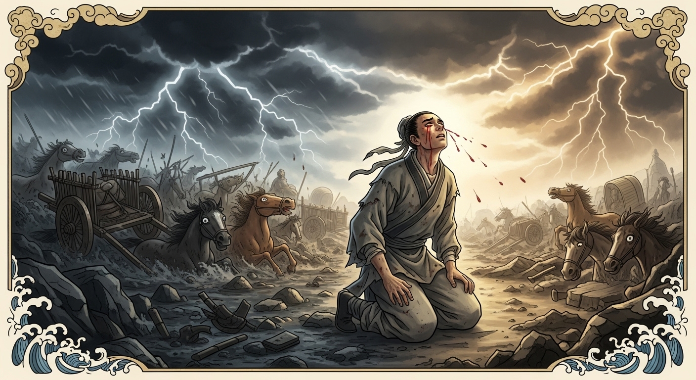 최고의 혼란, 피눈물을 흘려요. 끝까지 버티는 게 중요해요. 이야기 속 해당 부분: "말과 수레가 다시 흩어지고, 젊은이는 피눈물을 흘리며 울었어요. ... 그 눈물 속에서 마을은 결국 안정되었고..." 절망 속에서도 희망이 싹트죠.