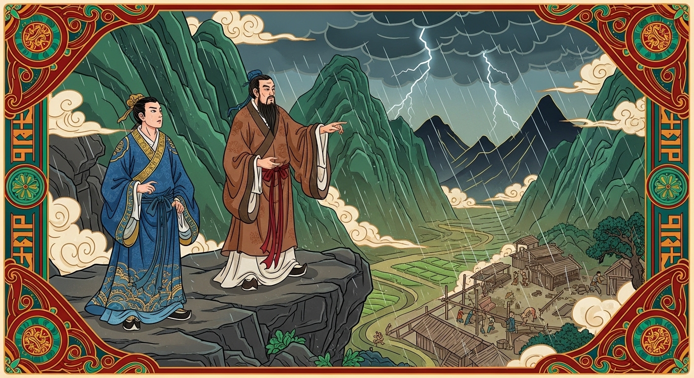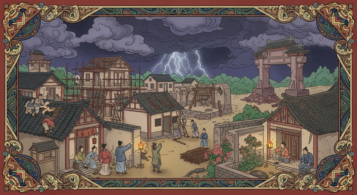 옛날 옛적, 하늘과 땅이 처음 교합한 후 세상이 아직 안정되지 않은 때에, 한 젊은이가 '번개의 마을'을 세우려 했어요. 그는 산속에서 태어나, 천둥소리가 울리는 비바람 속에서 자랐죠. 마을을 세우는 일은 쉽지 않았어요. 처음에는 바위처럼 버티며 머뭇거렸어요. "이 길이 맞을까?" 하며 망설이다가, 결국 믿을 만한 도우미를 임명했어요. 그 도우미 덕에 첫걸음을 뗄 수 있었죠.