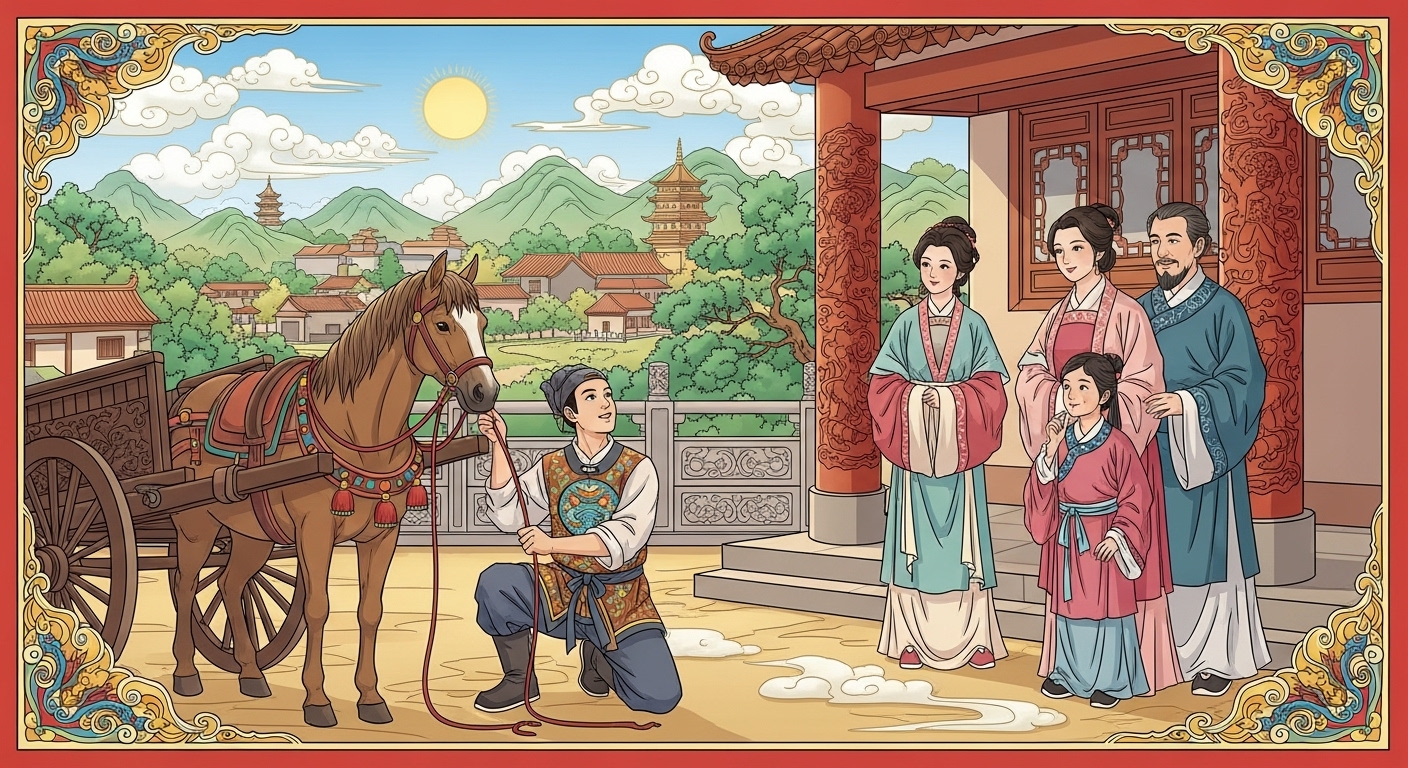 그런데 어려움이 쌓이기 시작했어요. 젊은이가 말을 타고 수레를 끌며 나아가는데, 길이 막히고 말과 수레가 따로따로 흩어져 버렸어요. "이게 웬일이야!" 하며 당황하는데, 갑자기 한 아름다운 처녀가 나타났어요. 처음엔 강도인가 싶었지만, 아니었어요. 그녀는 미래의 짝이었죠. 하지만 처녀는 순결을 지키며 "아직 때가 아니야"라고 했어요. 젊은이는 10년을 기다려야 했고, 마침내 그녀와 결혼할 수 있었어요.