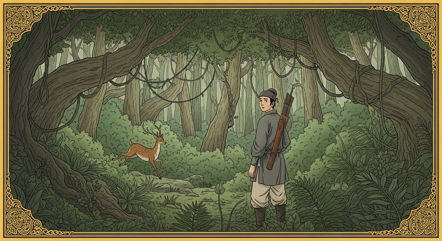 기운이 솟아 젊은이는 사슴 사냥을 나섰어요. "큰 사슴을 잡아 마을의 상징으로 삼자!" 했지만, 안내인 없이 숲으로 들어가 버렸어요. 깊은 숲속에서 길을 잃고 헤매다, "이건 잘못된 선택이야"라고 깨달았어요. 현명하게 포기하고 돌아왔지만, 그 과정에서 약간의 수치심을 느꼈죠.