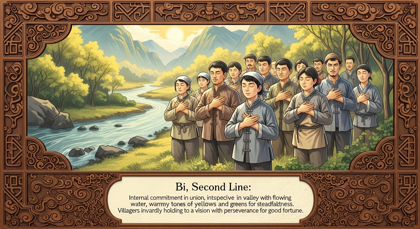 This line suggests internal commitment to the union for success. Matching part in the tale: "Inwardly, the villagers held to the elder's vision with perseverance, leading to good fortune in their bonds." Inner steadfastness strengthens alliances. Annotation: I Ching Bi hexagram second line: "The second SIX, divided, shows its subject seeking union from within. With firm correctness there will be good fortune."