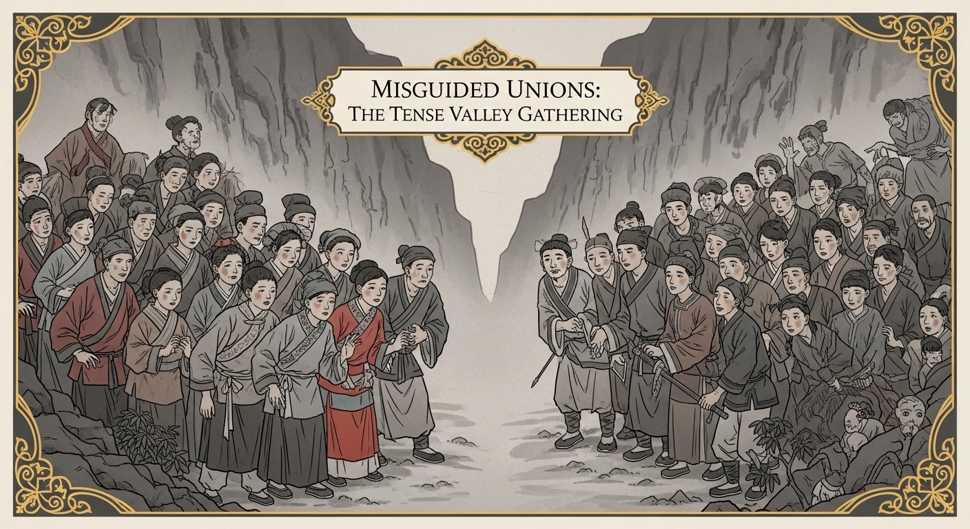 This line indicates failure in union due to arriving too late or lacking leadership. Matching part in the tale: "But those who arrived too late found no leader to hold the group together, resulting in misfortune as the alliance dissolved." Timing and guidance are crucial. Annotation: I Ching Bi hexagram top line: "The topmost SIX, divided, shows him with no head for union. There will be evil."