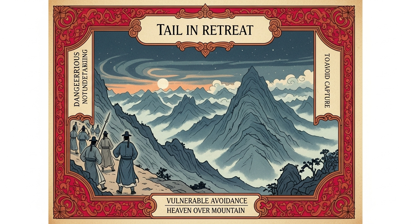 This line warns of peril at the rear of retreat, advising against any action to avoid worsening danger. Matching part in the tale: "At the tail end of the retreat, danger lurked as stragglers were pursued; one must not undertake rash actions to avoid capture." This symbolizes avoiding engagement when vulnerable.