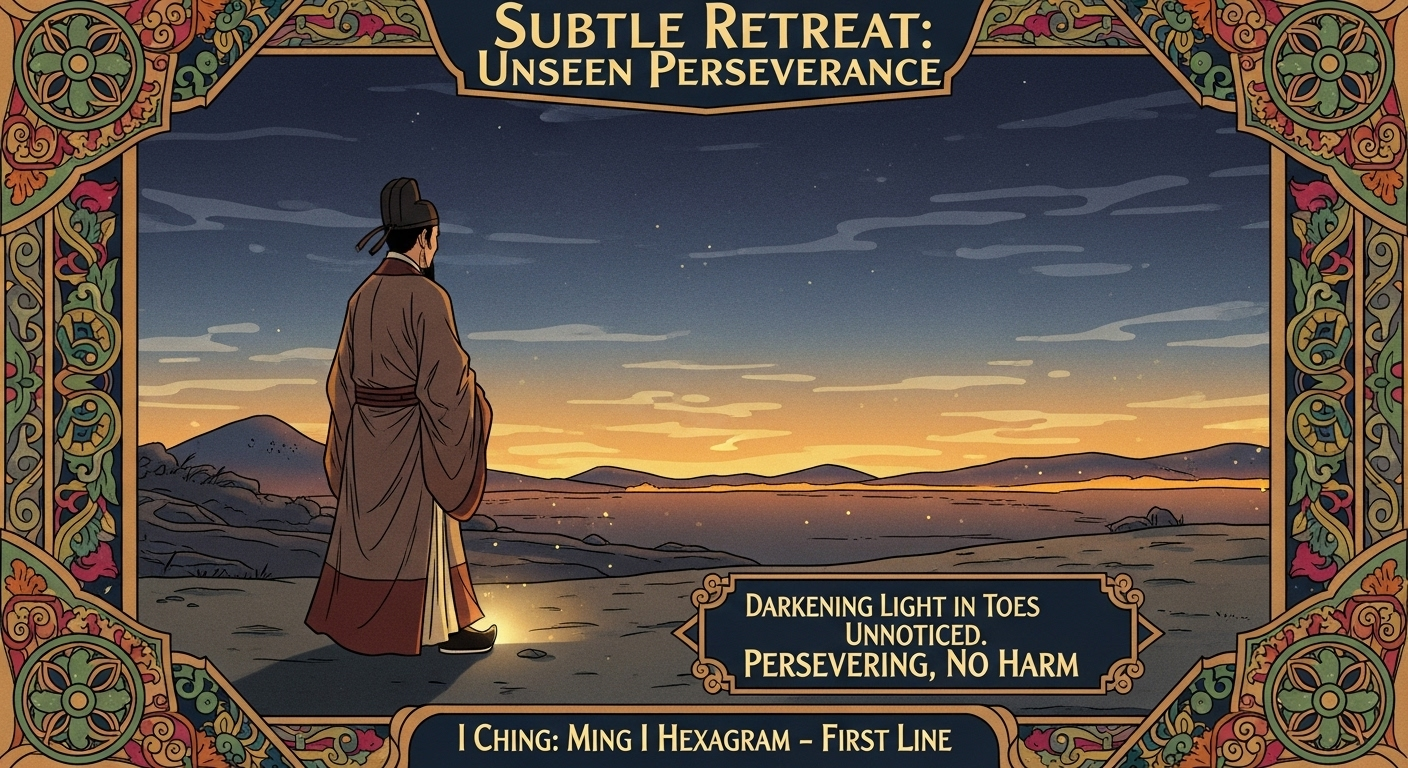 This line suggests hiding one's light during retreat, with disciplined perseverance leading to success. Matching part in the tale: "At the outset, his light darkened in his toes, a small injury unnoticed by foes; he persevered, and no harm came." This symbolizes subtle concealment ensuring safety on a journey. Annotation: I Ching Ming I hexagram first line: "Darkening of the light during flight. He lowers his wings. The superior man on a journey for three days does not drink. He has somewhere to go. Good fortune."