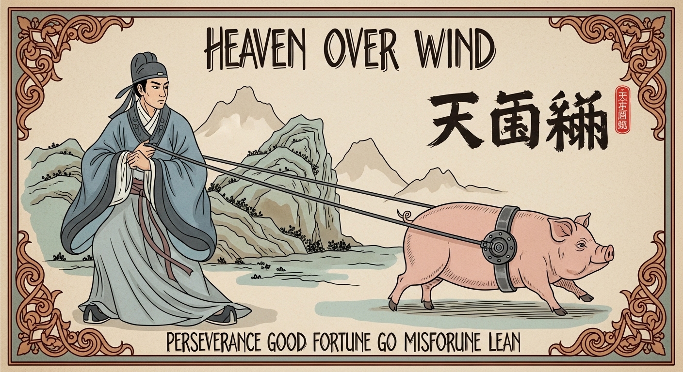 Once upon a time, under vast heavens where winds whispered unexpected meetings, a young prince ventured into a mysterious forest and encountered a powerful maiden who seemed to emerge from the breeze itself. The maiden was powerful, and one should not marry such a maiden, for the encounter signaled caution amid temptation. At the outset, tied to a metal brake, perseverance brought good fortune; if he had somewhere to go, he would see misfortune, like a lean pig with power to run but restrained.